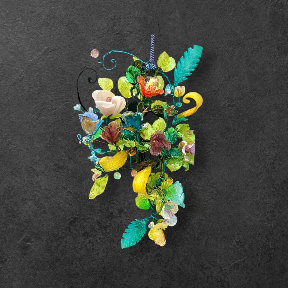 薄いピンクやルビー色いら、海や空の色のブルー、アラバストロ(乳白)やオロ(金)のヴェネチアンガラスの花弁やリーフを添え、作品が華やかになりました。