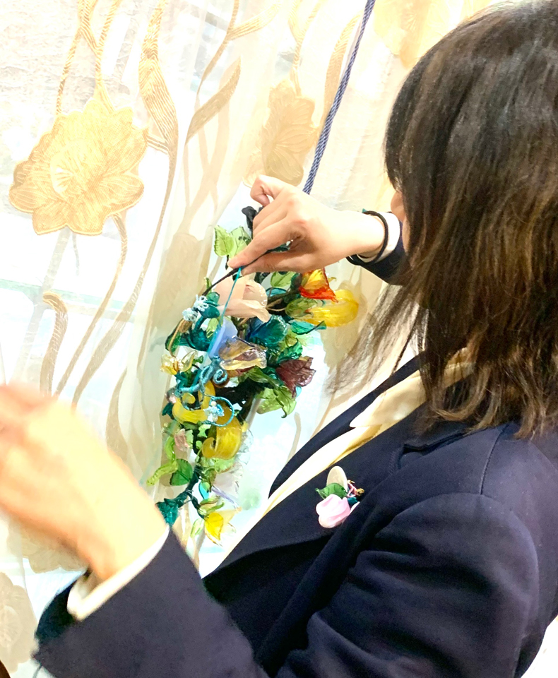 その中で、一部欠損した茎やリーフの材料を修正しながら、重いヴェネチアンガラスを支えるための軸や骨組みとして取り入れ、全体のバランスを保つことを意識し、ト音記号や五線譜に取り付けていく作業が続きました。